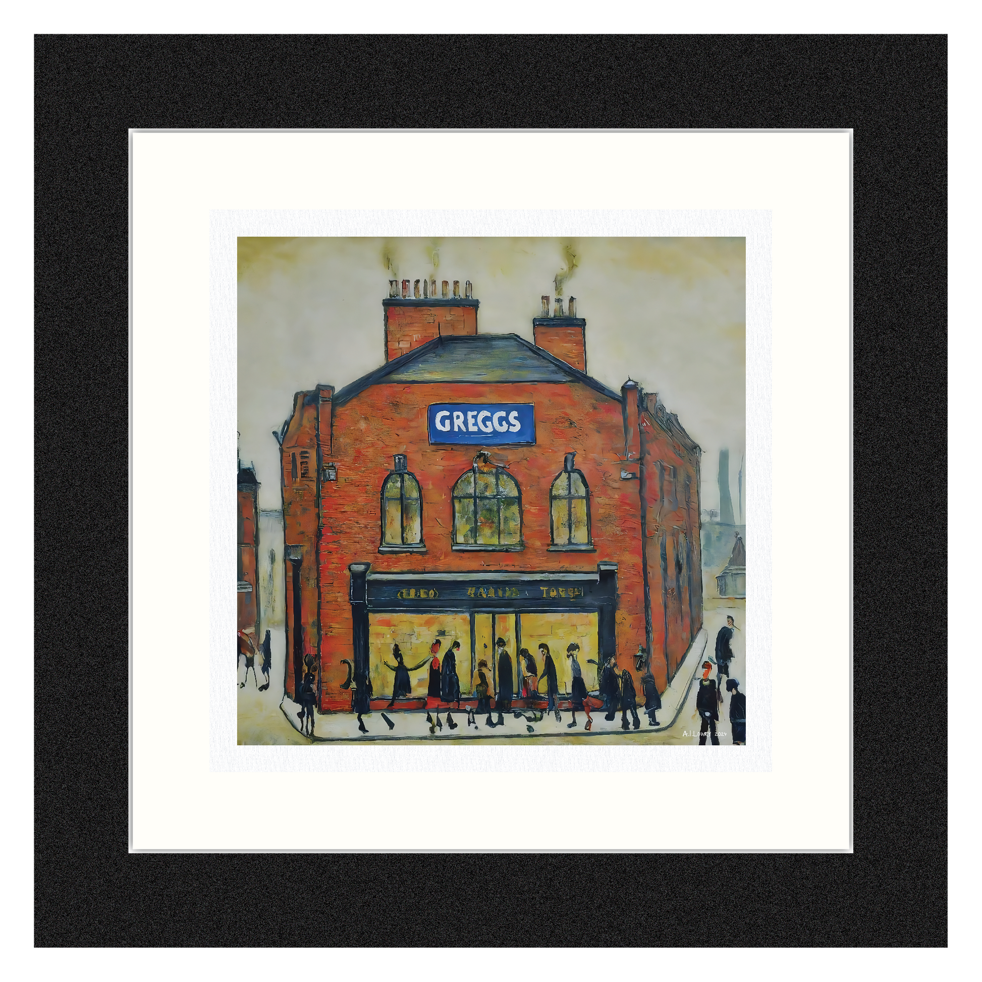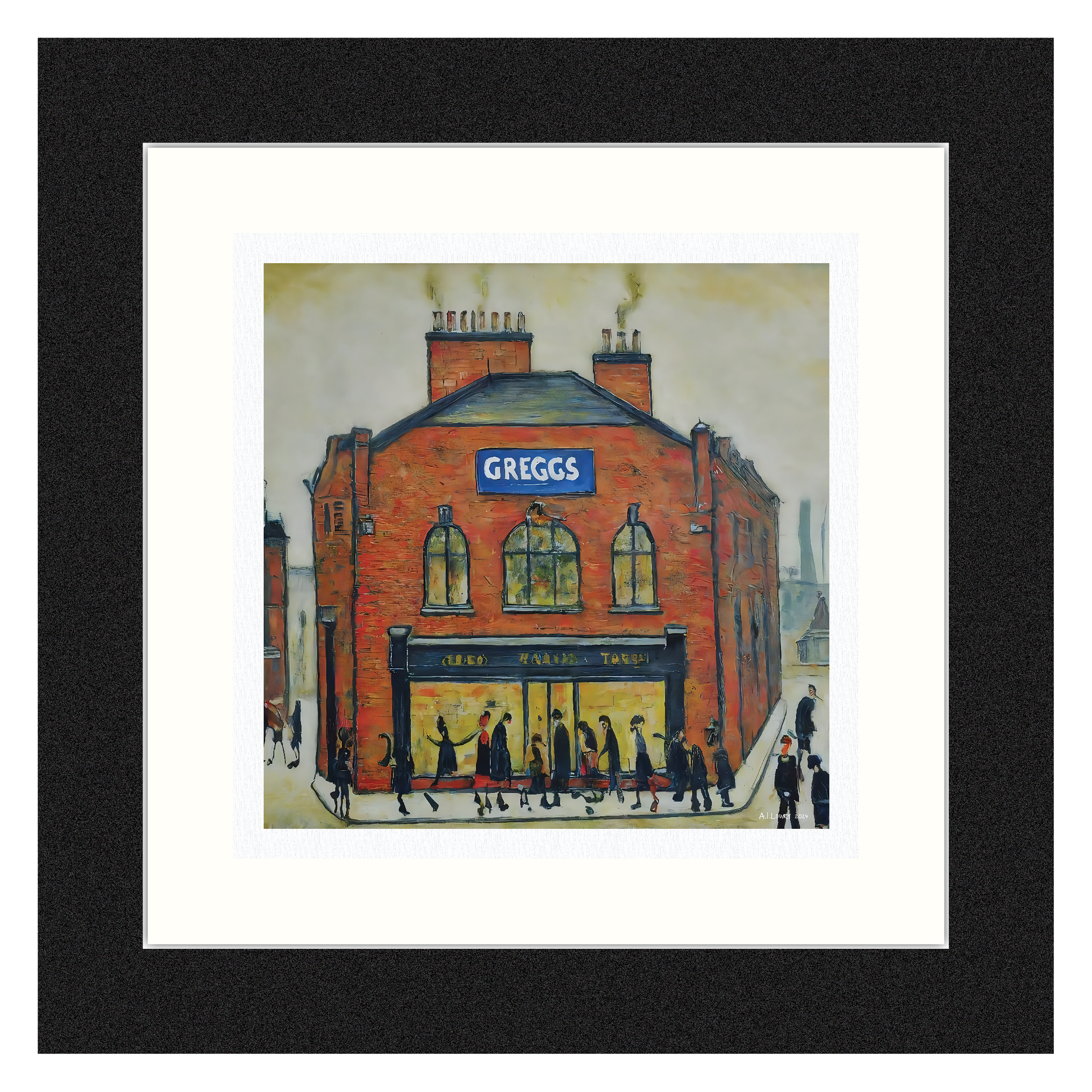 Description : Cette reproduction d'art représentant Greggs, célèbre boulangerie britannique, est une illustration créative dans un format stylisé inspiré de LS Lowry. L'agitation quotidienne de Greggs prend vie avec une touche ludique et artistique.