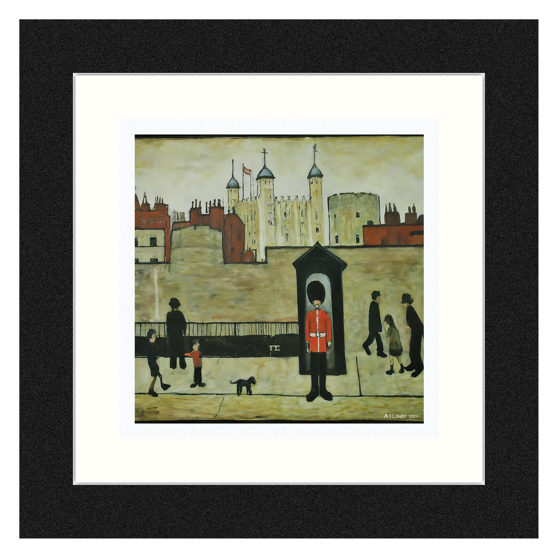 Voici « On Guard », une captivante impression d'art giclée qui représente la scène emblématique d'un garde en faction devant l'historique Tour de Londres. Cette image, inspirée du style distinctif de LS Lowry, combine la solennité du garde avec les activités quotidiennes des passants. L'œuvre d'art incarne le mélange de tradition et de vie moderne, représenté dans le style minimaliste caractéristique de Lowry.