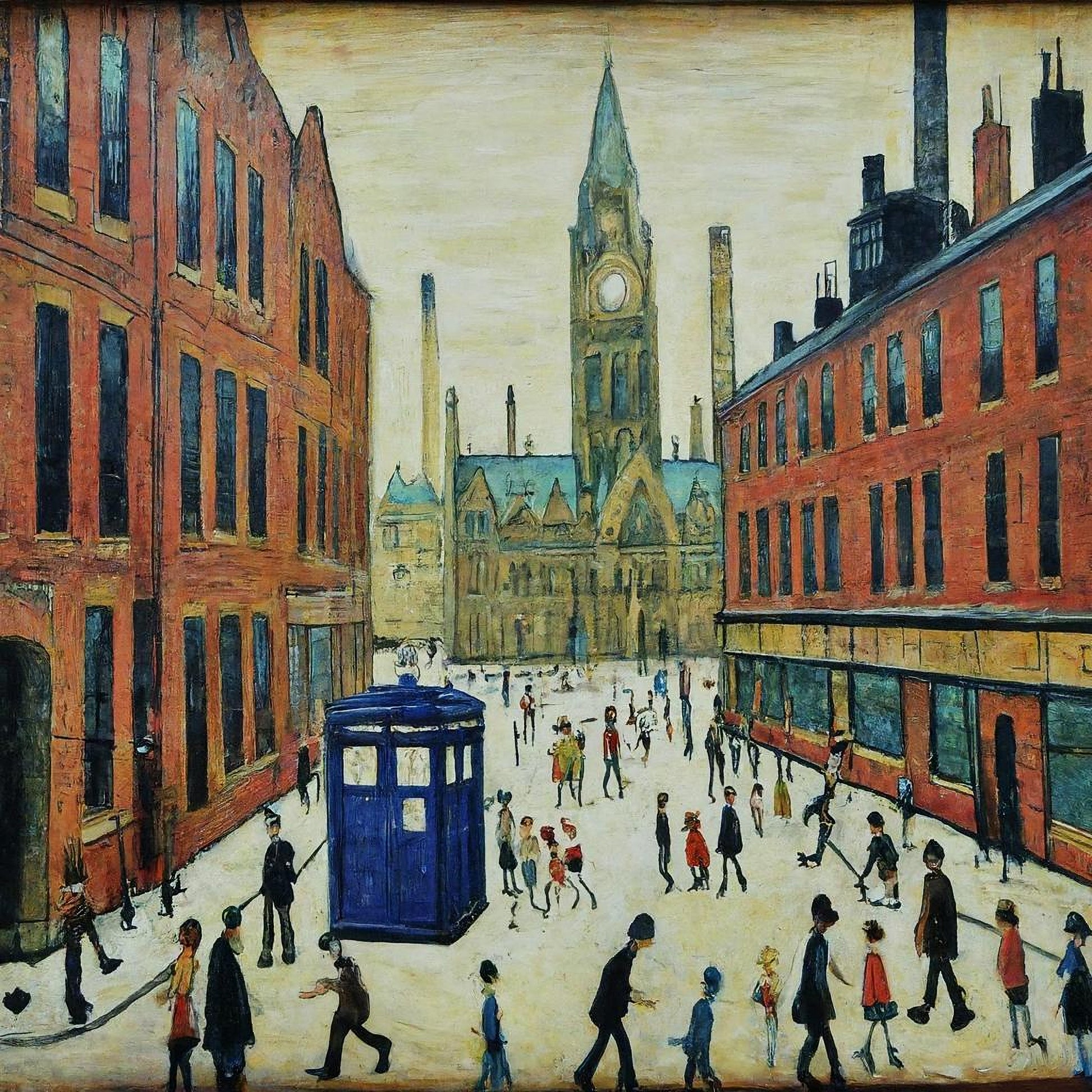 Step back in time with "The Doctor Comes To Town" print. A blue police box seems to have appeared out of nowhere on the streets of Manchester. Well that's what we imagined Lowry might have been painting. It remains one of our best sellers. Versions are also available in A4 and A3 sizes.